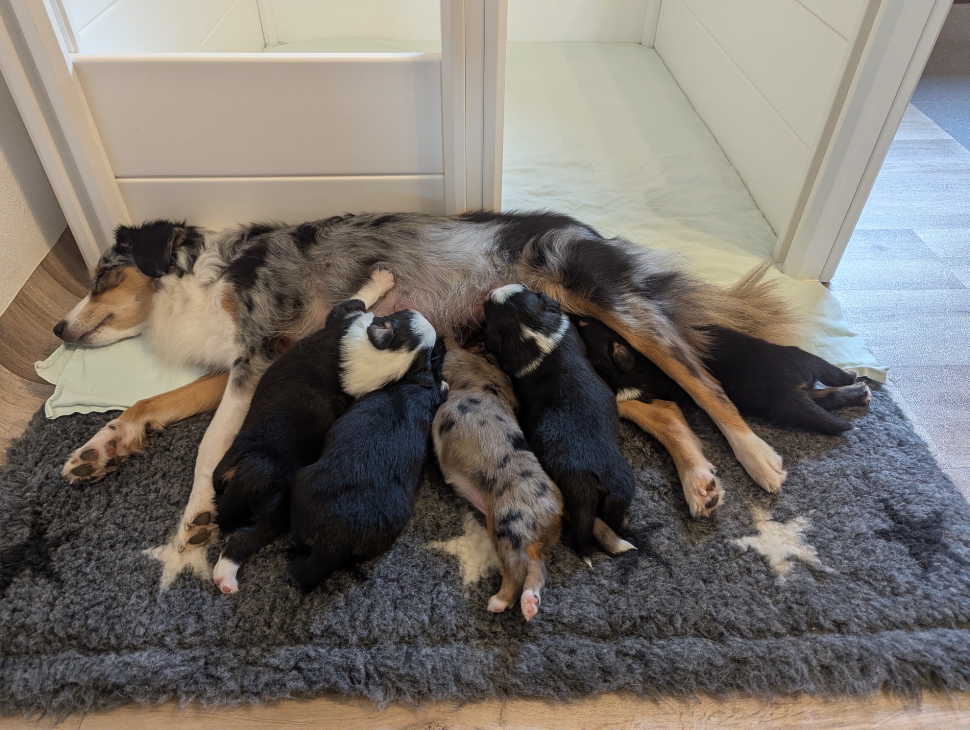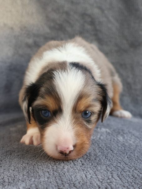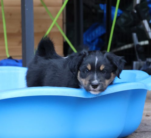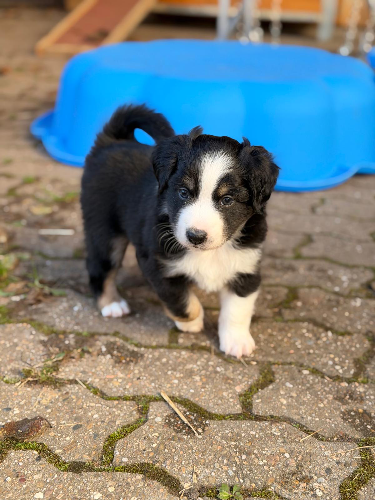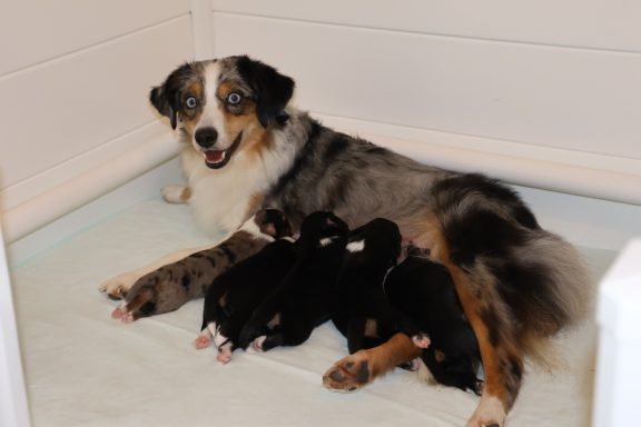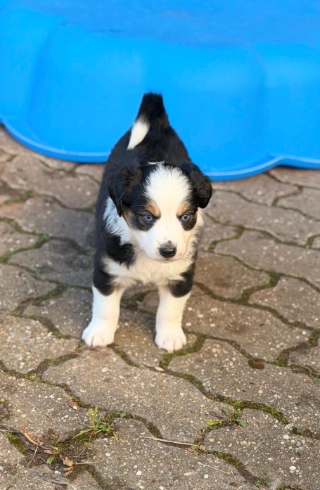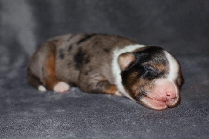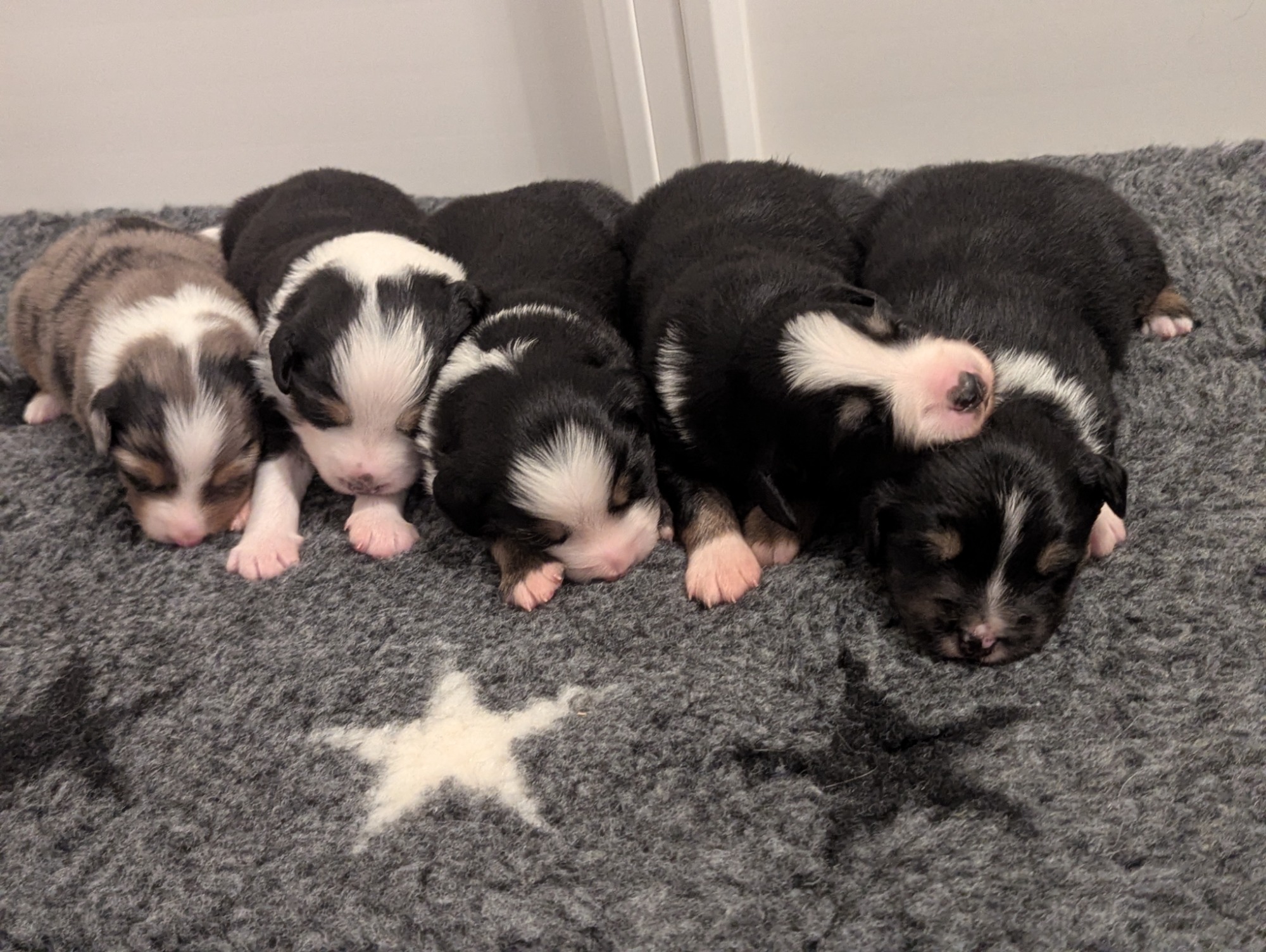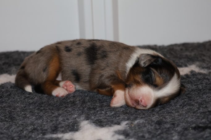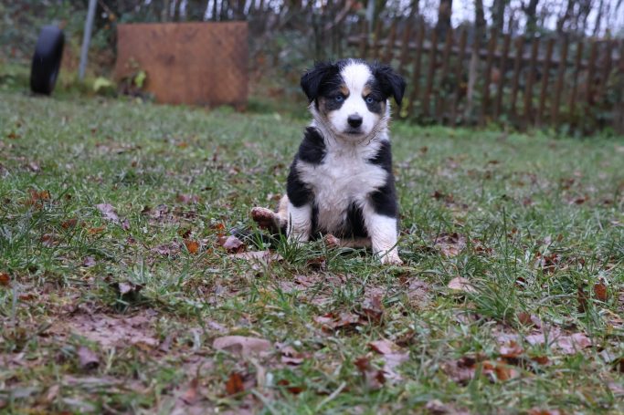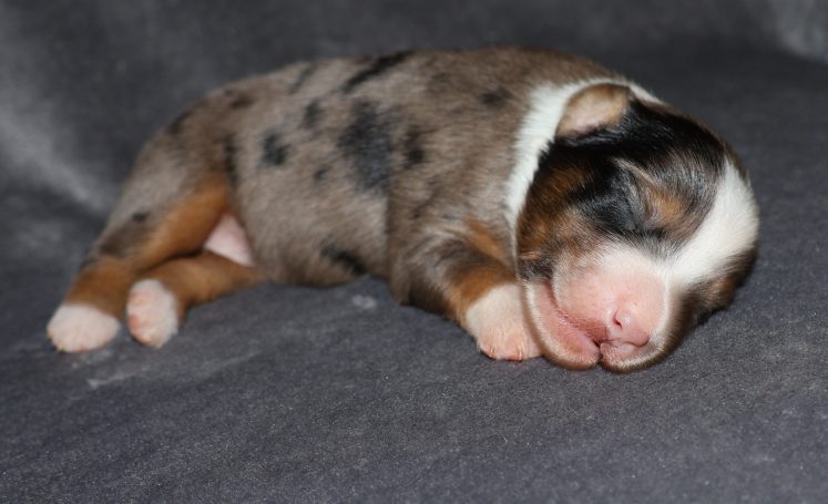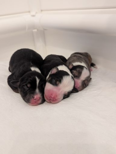 Geboren wurden 2 Hündinnen in Blue Merle und Black Tri und 3 Rüden in Black Tri.